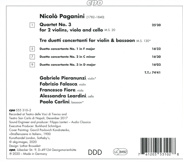 Beschreibung:One aspect in the life and work of the great Genoese virtuoso Nicolò Paganini that may be lesser known but in no way should be underestimated is the pronounced interest with which he dedicated himself to chamber music both as an interpreter and as a composer. He was drawn in particular to the genre of the string quartet - and here we are presenting his energetic String Quartet No. 3, a work revealing his brilliant mastery in the field of chamber music. In his Tre Duetti for violin and bassoon Paganini also proves to be a very sophisticated composer of chamber music who succeeds in lending each of the three duets an individual, independent character. Among other things, these works have in common the beautiful cantability of their themes and a writing style radiating obvious joy in the shared musical experience, in "jouer," as the French so fittingly term it. The influence of song is in constant evidence when we speak of the Italian instrumental music of the nineteenth century in general and in particular of Paganini's chamber music or that of composers such as Rossini and Donizetti who distinguished themselves mainly in the field of the opera. In the three duets this vocal influence is naturally combined with the clear requirements of instrumental part writing., Runningtime: 00:00:00, Labelcode CPO555310.2