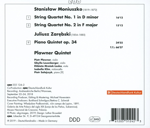 Beschreibung:While the music world is getting ready for next year's 250th anniversary of Ludwig van Beethoven's birth, this year's bicentennial of the birth of the Polish national composer Stanislaw Moniuszko has gone practically unnoticed outside Poland. For this reason, this new recording of his two string quartets is all the more welcome. The composer who would become the celebrated master of the operas Halka and The Haunted Manor wrote these quartets during or shortly after his Berlin study years and in a style continuing to draw on the vocabulary of classical models. At the same time, the twenty-year-old student displays a sense of humor, melodicism, and chamber finesse that not only make for a genuinely rewarding listening experience but also are worth hearing again and again. A "late" creation by Moniuszko's young fellow Pole Juliusz Zarebski is being presented here together with the quartets. At the end of his life this favorite pupil and confidant of Franz Liszt wrote an absolutely "avant-garde" piano quintet that might have launched a bold and daring oeuvre but ended up serving as a farewell: when this virtuoso pianist and composer delighting in experiment died in 1885, he was a mere thirty-one years old., Runningtime: 00:00:00, Labelcode CPO555124.2