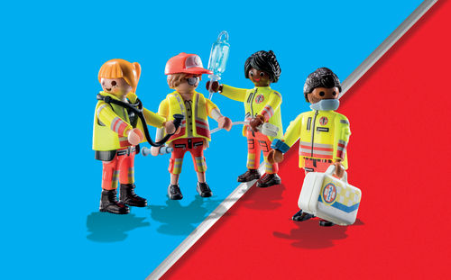 Beschreibung:Schließe dich dem PLAYMOBIL-Rettungsteam an und werde zum Helden des Alltags. Das vierköpfige Team ist nicht nur bestens ausgebildet, sondern auch ideal gerüstet für alle Notfälle. Im Falle eines Herzinfarktes haben die Sanitäterinnen und Sanitäter ihre moderne Defibrillatortasche dabei. Mit dem Defibriallator kann Patienten schnell geholfen werden. Defibrillatortasche und Arztkoffer bieten Platz für weiteres medizinisches Zubehör wie Schere, Pinzette und Verbandsschienen. Die Schienenverbände aus Silikon passen sich flexibel an. Ran ans Stethoskop und auf in den Einsatz! Das detailreiche Spielfigurenset für Kinder ab 4 Jahren enthält vier PLAYMOBIL-Figuren, Infusionsflasche mit Schlauch, Erste-Hilfe-Instrumente, Verbandsschienen, Arztkoffer und weiteres Zubehör für spannende Notfallmissionen im Kinderzimmer. Kopfbedeckungen, Mundschutzmaske und Uhr können den Figuren abgenommen werden. Die PLAYMOBIL City Life Reihe beinhaltet moderne Fahrzeuge und realitätsgetreue Modelle, mit denen Kinder wichtige Fähigkeiten und Selbstvertrauen entwickeln können. Inhalt: 2 Männer, 2 Frauen Zubehör: 1 Infusion mit Infusionsschlauch, 1 Stetoskop, 1 Erste Hilfe Instrumente, 2 Verbandsschienen, 1 Wasserflasche, 1 Defibrilator, 1 Verbandskoffer, 1 Cap, 1 Armbanduhr