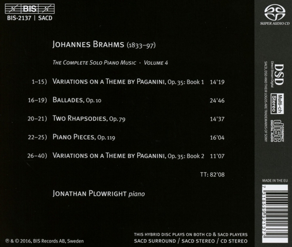 Variationen über ein Thema von Niccol? Paganini op. 35: Teil 1 01. "Thema: Non troppo presto" 02. "Variation 1" 03. "Variation 2" 04. "Variation 3" 05. "Variation 4" 06. "Variation 5" 07. "Variation 6" 08. "Variation 7" 09. "Variation 8" 10. "Variation 9" 11. "Variation 10" 12. "Variation 11: Andante" 13. "Variation 12" 14. "Variation 13" 15. "Variation 14: Allegro - Presto, ma non troppo" Balladen op. 10 Nr. 1-4 16. "Nr. 1 Andante - Poco pi? moto - Allegro (ma non troppo) - Tempo 1" 17. "Nr. 2 Andante - Allegro non troppo - Tempo 1" 18. "Nr. 3 Intermezzo: Allegro" 19. "Nr. 4 Andante con moto - Pi? lento - Tempo 1 - Adagio" 20. "Rhapsodie h-moll op. 79 Nr. 1" 21. "Rhapsodie g-moll op. 79 Nr. 2" Stücke für Klavier op. 119 Nr. 1-4 22. "Nr. 1 Intermezzo: Adagio" 23. "Nr. 2 Intermezzo: Andantino un poco agitato - Andante grazioso - Tempo 1" 24. "Nr. 3 Intermezzo: Grazioso e giosco" 25. "Nr. 4 Rhapsody: Allegro risoluto" Variationen über ein Thema von Niccol? Paganini op. 35: Teil 2 26. "Thema: Non troppo presto" 27. "Variation 1" 28. "Variation 2: Poco animato" 29. "Variation 3" 30. "Variation 4: Poco allegretto" 31. "Variation 5" 32. "Variation 6: Poco pi? vivace" 33. "Variation 7" 34. "Variation 8: Allegro" 35. "Variation 9" 36. "Variation 10: Feroce, energico" 37. "Variation 11: Vivace" 38. "Variation: Un poco andante" 39. "Variation: Un poco pi? andante" 40. "Variation: Presto, ma non troppo"