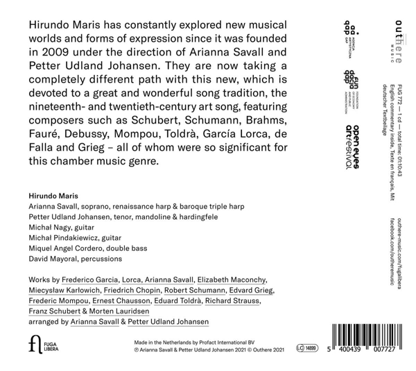 | Beschreibung: | Hirundo Maris has constantly explored new musical worlds and forms of expression since it was founded in 2009 under the direction of Arianna Savall and Petter Udland Johansen. They are now taking a completely different path with this new project for the label Fuga Libera, which is devoted to a great and wonderful song tradition, the nineteenth- and twentieth-century art song, featuring composers such as Schubert, Schumann, Brahms, Fauré, Debussy, Mompou, Toldrà, García Lorca, de Falla and Grieg - all of whom were so significant for this chamber music genre. "The love of poetry and music that we (Arianna Savall and Petter Udland Johansen) share is something that we invariably explore in all our projects with Hirundo Maris. It was very important for us to do this in our own personal way, and to bring to the music our own personal sound and love. That is why we arranged all of the music anew so that it would integrate with the musical universe of Hirundo Maris. You will hear a great love and respect for this music made by these fantastic composers in the spirit of Hirundo Maris, with music coming from the sunny Mediterranean and reaching to frosty Scandinavia.", Runningtime: 00:00:00, Double Bass: Miguel Angel Cordero, Ensemble: Hirundo Maris, Guitar: Micha? Nagy, Guitar: Micha? Pindakiewicz, Percussion [Percussions]: David Mayoral, Soprano Vocals, Harp [Renaissance], Harp [Baroque Triple]: Arianna Savall, Tenor Vocals, Mandolin, Hardingfele: Petter Udland Johansen, Composed By: Federico García Lorca, Composed By: Federico García Lorca, Composed By: Arianna Savall, Composed By: Elizabeth Maconchy, Composed By: Mieczys?aw Kar?owicz, Composed By: Frédéric Chopin, Composed By: Robert Schumann, Composed By: Edvard Grieg, Composed By: Edvard Grieg, Composed By: Edvard Grieg, Composed By: Edvard Grieg, Composed By: Frederic Mompou, Composed By: Frederic Mompou, Composed By: Ernest Chausson, Composed By: Eduard Toldrà, Composed By: Eduard Toldrà, Composed By: Richard Strauss, Composed By: Franz Schubert, Composed By: Franz Schubert, Composed By: Franz Schubert, Composed By: Morten Lauridsen, Labelcode FUGL772.2 (FUG772) |