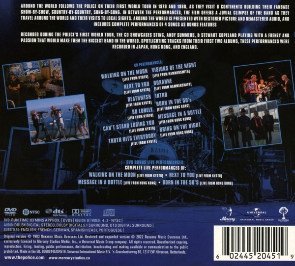 Disc 02 01. Police, The "Walking On The Moon (Live From Kyoto / 1980)" 02. Police, The "Next To You (Live From Kyoto / 1980)" 03. Police, The "Deathwish / Bo Diddley (Live From Kyoto / 1980 / Medley)" 04. Police, The "So Lonely (Live From Kyoto / 1980)" 05. Police, The "Can't Stand Losing You / Day-O (Live From Kyoto / 1980 / Medley)" 06. Police, The "Truth Hits Everybody (Live From Kyoto / 1980)" 07. Police, The "Visions Of The Night (Live From Hammersmith, London / 1979)" 08. Police, The "Roxanne (Live From Hammersmith, London / 1979)" 09. Police, The "Intro (Live From Hong Kong / 1980)" 10. Police, The "Born In The 50's (Live From Hong Kong / 1980)" 11. Police, The "Message In The Bottle (Live From Hong Kong / 1980)" 12. Police, The "Bring On The Night (Live From Hong Kong / 1980)"