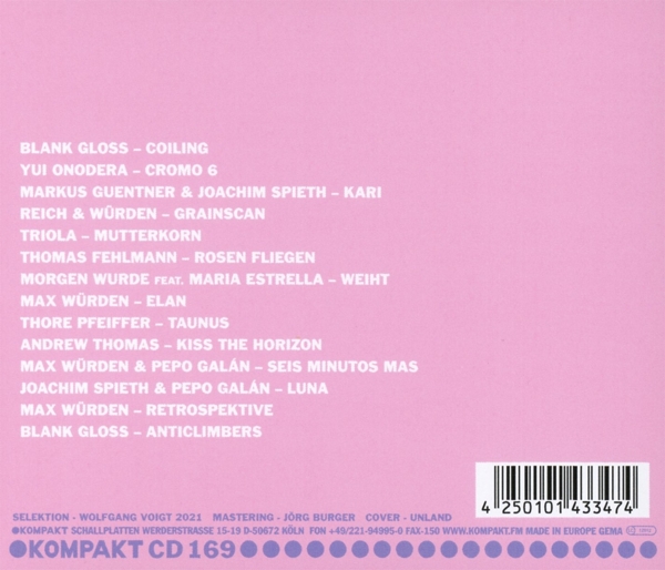 01. Blank Gloss "Coiling" 02. Onodera, Yui "Cromo6" 03. Güntner, Markus / Spieth, Joachim "Kari" 04. Reich & Würden "Grainscan" 05. Triola "Mutterkorn" 06. Fehlmann, Thomas "Rosen fliegen" 07. Morgen Wurde / Estrella, Maria "Weiht" 08. Würden, Max "Elan" 09. Pfeiffer, Thore "Taunus" 10. Thomas, Andrew "Kiss the horizon" 11. Würden, Max / Galán, Pepo "Seis minutos mas" 12. Spieth, Joachim / Galán, Pepo "Luna" 13. Würden, Max "Retrospektive" 14. Blank Gloss "Anticlimbers"