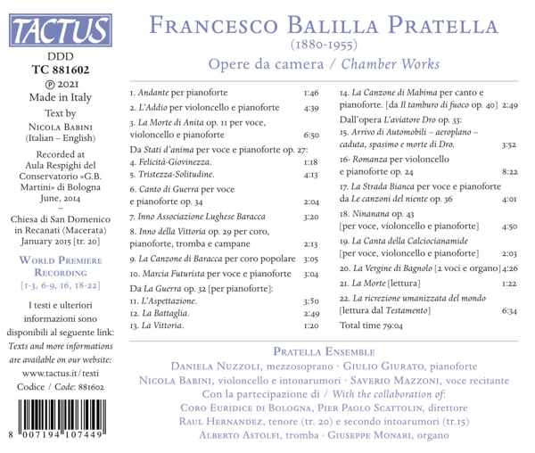 Beschreibung:Francesco Balilla Pratella, one of the most important and eclectic figures of the early-twentieth- century cultural scene in Italy, molded his life to the constant pursuit of spiritual ascension and the quest for the essence of man. For him, these conditions were indispensable for achieving the "humanized re-creation of the world", the primary, essential goal of an artist-creator: "Creation, in an absolute sense, is not a human faculty; we cannot add or remove anything in the universe. But we can humanly re-create the universe, that is, translate it and re-express it with images and values that are essentially human. This is what art is, and this is what life is: a human re-creation of the world in it's terms and values, and only for man: a humanization of the world." So he re-created the world, his world, untiringly dividing himself between musical composition, teaching, the passionate study of folk traditions, and the writing of hundreds and hundreds of theoretic, critical, musical-aesthetic and philosophic texts. The Pratella Ensemble is the interpreter of this production that collects a varied anthology of the composer's chamber production: lieder, instrumental and choral pages that reflect the work and life of a highly original author, protagonist of a historical and cultural moment - that of the futurism - of great experimentation and artistic travail., Runningtime: 00:00:00, Labelcode TCS881602.2