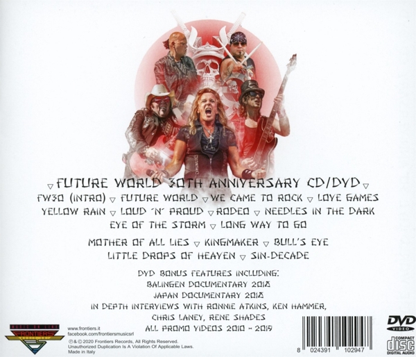 Disc 02 01. Pretty Maids "Future world intro" 02. Pretty Maids "Future world" 03. Pretty Maids "We came to rock" 04. Pretty Maids "Love games" 05. Pretty Maids "Yellow rain" 06. Pretty Maids "Loud 'n' proud" 07. Pretty Maids "Rodeo" 08. Pretty Maids "Needles in the dark" 09. Pretty Maids "Eye of the storm" 10. Pretty Maids "Long way to go" 11. Pretty Maids "Mother of all lies" 12. Pretty Maids "Kingmaker" 13. Pretty Maids "Bull's eye" 14. Pretty Maids "Little drops of heaven" 15. Pretty Maids "Sin-decade" 16. Keine Künstlerinformation "Credits" 17. Keine Künstlerinformation "Balingen Documentary" 18. Keine Künstlerinformation "Japan Documentary" 19. Keine Künstlerinformation "Interview Ronnie Atkins - Summer of 2018" 20. Keine Künstlerinformation "Interview Ken Hammer - Summer of 2018" 21. Keine Künstlerinformation "Interview Chris Laney - Summer of 2018" 22. Keine Künstlerinformation "Interview Rene Shades - Summer of 2018" 23. Pretty Maids "Little drops of heaven (Music Video)" 24. Pretty Maids "Mother of all lies (Music Video)" 25. Pretty Maids "Nuclear boomerang (Music Video)" 26. Pretty Maids "My soul to take (Music Video)" 27. Pretty Maids "A heart without a home (Music Video)" 28. Pretty Maids "Kingmaker (Music Video)" 29. Pretty Maids "Face the world (Music Video)" 30. Pretty Maids "Bull's eye (Music Video)" 31. Pretty Maids "Last beauty on earth (Music Video)" 32. Pretty Maids "Serpentine (Music Video)" 33. Pretty Maids "Will you still kiss me (when I see you in heaven) (Music Video)"