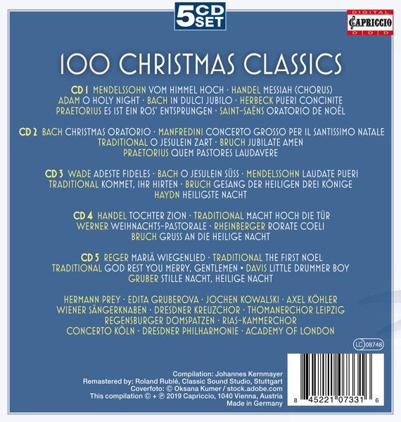 Disc 05 Weihnachts-Oratorium BWV 248 (Auszug) 01. Vokalensemble Frankfurt "Chor: Ehre sei Gott" 02. Thomanerchor Leipzig "Lasst uns das Kindlein wiegen" Sonate für Trompete G-Dur (Auszug) 03. Steiner, Wolfgang "3. Lento dolce" 04. Dresdner Kreuzchor "Allelujah! - Freuet euch ihr Christen" 05. Capella Gregoriana "O admirabile commercium" 06. Rheinische Kantorei "Holde, holde Wundernacht (Hirtenlied)" Weihnachtsoratorium op. 12 (Auszug) 07. Selbig, Ute "Et pastores errant - Gloria" 08. Regensburger Domspatzen "Mari? Wiegenlied" 09. hr-brass "Canzona Nr. 25 a 8" 10. Rostocker Motettenchor "Jesu, du mein liebstes Leben BWV 356" 11. Wiener S?ngerknaben "The first No?l" Concerto grosso g-moll op. 8 Nr. 6 (Auszug) 12. Erxleben, Michael "1. Grave - Vivace - 2. Largo" Jauchzet Gott in allen Landen BWV 51 (Kantate) (Auszug) 13. Gruberova, Edita "Arie: Sei Lob und Preis mit Ehren" 14. Wiener S?ngerknaben "God rest you merry, gentlemen" Weihnachtsoratorium op. 12 (Auszug) 15. Selbig, Ute "Quare fremuerunt gentes?" Geistliche Ges?nge op. 138 (8 Motetten) (Auszug) 16. Dresdner Kreuzchor "Nr. 4 Und unser lieben Frauen" 17. Wiener S?ngerknaben "The little drummer boy" 18. Kowalski, Jochen "Heilige Nacht" 19. Wiener S?ngerknaben "Stille Nacht, heilige Nacht" Weihnachts-Oratorium BWV 248 (Auszug) 20. Vokalensemble Frankfurt "Choral: Nun seid ihr wohl gerochen"