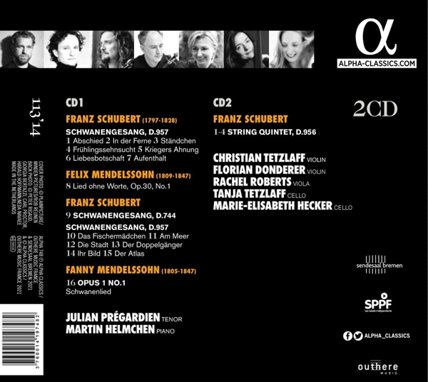 Disc 01 Schwanengesang, D. 957 01. Julian Pr?gardien "Abschied" 02. Julian Pr?gardien "In der ferne" 03. Julian Pr?gardien "St?ndchen" 04. Julian Pr?gardien "Frühlingssehnsucht" 05. Julian Pr?gardien "Kriegers Ahnung" 06. Julian Pr?gardien "Liebesbotschaft" 07. Julian Pr?gardien "Aufenthalt" 08. Julian Pr?gardien "Lieder ohne Worte, Op. 30" 09. Julian Pr?gardien "Schwanengesang, D. 744" Schwanengesang, D. 957 10. Julian Pr?gardien "Das Fischerm?dchen" 11. Julian Pr?gardien "Am Meer" 12. Julian Pr?gardien "Die Stadt" 13. Julian Pr?gardien "Der Doppelg?nger" 14. Julian Pr?gardien "Ihr Bild" 15. Julian Pr?gardien "Der Atlas" 16. Julian Pr?gardien "Schwanenlied, Opus 1 No.1"