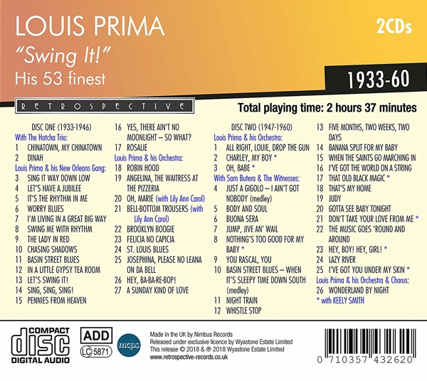Disc 01 01. Prima, Louis / Hotcha Trio, The "Chinatown, my Chinatown" 02. Prima, Louis / Hotcha Trio, The "Dinah" 03. Prima, Louis & His New Orleans Gang "Sing it way down low" 04. Prima, Louis & His New Orleans Gang "Let have a jubilee" 05. Prima, Louis & His New Orleans Gang "It's the rhythm in me" 06. Prima, Louis & His New Orleans Gang "Worry blues" 07. Prima, Louis & His New Orleans Gang "I'm living in a great big way" 08. Prima, Louis & His New Orleans Gang "Swing me with rhythm" 09. Prima, Louis & His New Orleans Gang "The lady in red" 10. Prima, Louis & His New Orleans Gang "Chasing shadows" 11. Prima, Louis & His New Orleans Gang "Basin street blues" 12. Prima, Louis & His New Orleans Gang "In a little gypsy tea room" 13. Prima, Louis & His New Orleans Gang "Let's swing it!" 14. Prima, Louis & His New Orleans Gang "Sing, sing, sing" 15. Prima, Louis & His New Orleans Gang "Pennies from heaven" 16. Prima, Louis & His New Orleans Gang "Yes, there ain't no moonlight - so what?" 17. Prima, Louis & His New Orleans Gang "Rosalie" 18. Prima, Louis & His Orchestra "Robin Hood" 19. Prima, Louis & His Orchestra "Angelina, the waitress at the pizzeria" 20. Prima, Louis & His Orchestra / Carol, Lily Ann "Oh, Marie" 21. Prima, Louis & His Orchestra / Carol, Lily Ann "Bell-bottom trousers" 22. Prima, Louis & His Orchestra "Brooklyn boogie" 23. Prima, Louis & His Orchestra "Felicia no capicia" 24. Prima, Louis & His Orchestra "St. Louis blues" 25. Prima, Louis & His Orchestra "Josephina, please no leana on da bell" 26. Prima, Louis & His Orchestra "Hey, ba-ba-re-bop!" 27. Prima, Louis & His Orchestra "A Sunday kind of love"