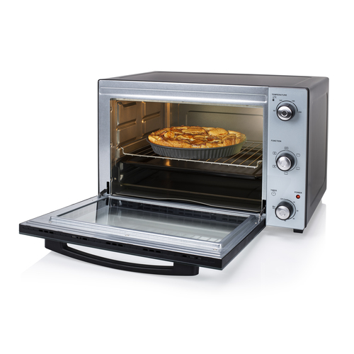 Beschreibung:Dieser Ofen mit 45 Liter Fassungsvermögen und Umluft ist zum Grillen, Backen und Toasten geeignet. Der Ofen hat 5 Heizstufen und ist mit 60-Minuten-Timer, Innenbeleuchtung, Backblech, Grillrost, Krümelblech und praktischem Griff ausgestattet. Hauptmerkmale Funktionen Netto-Ofenvolumen 45 l Produktfarbe Schwarz, Grau Geräteplatzierung Freistehend Steuerung Drehregler Eingebaute Anzeige Nein Innenbeleuchtung Ja Thermostatbereich 90 - 230 °C Ober- und Unterhitze Ja Oberheizung + Konvektion (Einzelbetrieb) Ja Ober- und Unterhitze + Grill + Konvektion (Einzelbetrieb) Ja Unterhitze Ja Gehäusematerial Metall Timer Ja Timer-Typ Mechanisch 99-Minuten-Timer 60 min Automatische Abschaltung Ja Backblechgriff Ja Anzahl der Glastür Paneele 2 Türmaterial Glas Rutschfeste Füße Ja Kochfunktionen und -programme Heißluftbetrieb Ja Rotisserie Nein Grill Nein Dampfgaren Nein Herkömmliches Kochen Ja Entfrostfunktion Nein Wieder heizen Funktion Nein Warmhaltefunktion Nein Energie Ofenleistung 1800 W Gewicht &