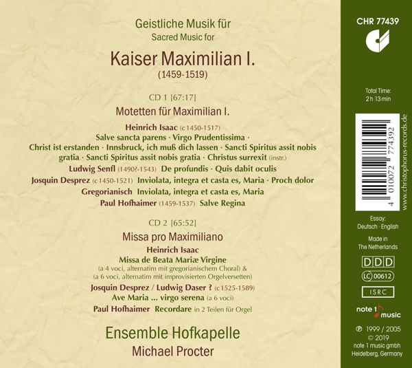 | Beschreibung: | 500 years ago, on 19 January 1519, Maximilian I (archduke of Austria, German king, and Holy Roman emperor) passed away. With his policies of wars and marriages, Maximilian I had laid the foundations upon which the Habsburgs built their immense power. In addition to extending this power, he promoted science and arts and defined himself as the 'last knight'. He founded a court chapel around the composer Heinrich Isaac, and gathered the most famous musicians of Europe. The programme on the first album includes motets by Isaac, Senfl and Josquin which were written for different sacred occasions at the Maximilian court. The second album features two Marian Masses composed for Maximilian by Isaac. The first one was set for four voices; the emperor must have liked it very much because he asked Isaac to revise it and build a six-voice version. The Ensemble Hofkapelle present the two masses in alternation with Gregorian chant (first mass) and organ improvisations in the style of Paul Hofhaimer, Maximilian's famous court organist (second mass)., Runningtime: 00:00:00, Labelcode CHS77439.2 |