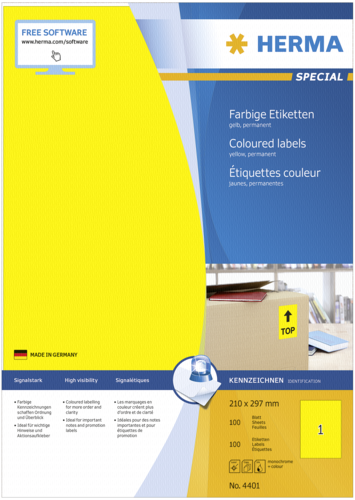 HERMA SuperPrint - Selbstklebende Etiketten - Gelb - A4 (210 x 297 mm) - 100 Stck. Gruppe Druckerverbrauchsmaterial Hersteller HERMA Hersteller Art. Nr. 4401 Modell SuperPrint EAN/UPC Produktbeschreibung: HERMA SuperPrint - selbstklebende Etiketten - 100 Stck. Medientyp Selbstklebende Etiketten Mediengröße A4 (210 x 297 mm) Drucktechnologie Nadel, Tintenstrahl, Laser Medienfarbe Gelb Anz. Karten/Etiketten pro Blatt/Rolle 1 Enthaltene Menge 100 Stck.