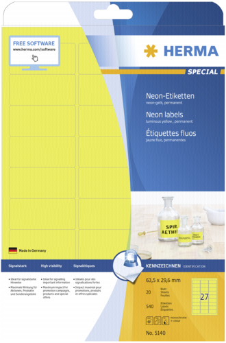 "Etiketten A4 neon-gelb 63,5x29,6 mm Papier 540 St." von Herma aus der Kategorie Drucker- & Kopierpapier ist Gelb. Es handelt sich bei dem Artikel um eine(n) Universal-Etiketten. Insgesamt wiegt der Artikel 265 g inklusive Verpackung. Das Produkt besteht aus Papier. Das Produkt nutzt Laser/Inkjet als Druckmethode.