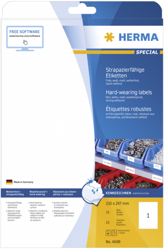 HERMA SuperPrint - Folienetiketten - weiß - A4 (210 x 297 mm) - 25 Stck. (25 Bogen x 1) Gruppe Druckerverbrauchsmaterial Hersteller HERMA Hersteller Art. Nr. 4698 Modell SuperPrint EAN/UPC 4008705046985 Produktbeschreibung: HERMA SuperPrint - Folienetiketten - 25 Stck. Medientyp Folienetiketten Mediengröße A4 (210 x 297 mm) Drucktechnologie Laser Medienfarbe Weiß Anz. Karten/Etiketten pro Blatt/Rolle 1 Anz. Medien mit Karten 25 Bogen Enthaltene Menge 25 Stck.