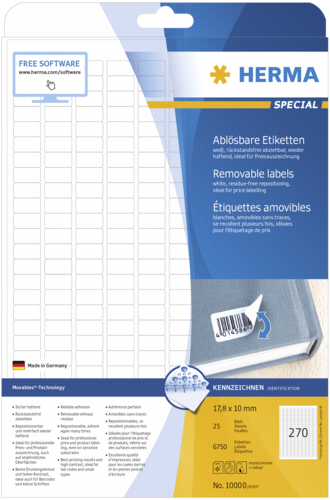 Der Artikel "Etiketten A4 weiß 17,8x10 mm ablösbar Papier 6750 St." von der Marke Herma hat die Farbe Weiß, vom Typ Universal-Etiketten und wird ein Gesamtgewicht von 307 g haben. Das Produkt besteht aus Papier. Verwendete Drucktechnologie: Laser/Inkjet.