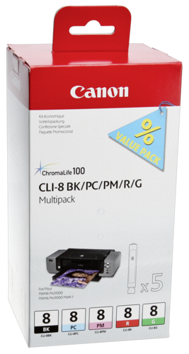 Der Artikel "CLI-8 Multipack BK/PC/PM/R/G [EURO-Version]" von der Marke Canon ist zu Pixma Pro 9000 kompatibel. Das Produkt unterstützt folgende Druckfarben: Schwarz, Grün, Rot. Das Produkt verfügt über folgende Drucktechnologie: Tintenstrahl.