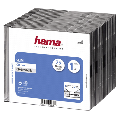 Der Artikel "1x25 Hama CD-Leerhülle CD-Box- Slim Schwarz 51167" von der Marke Hama ist Schwarz und ist aus Kunststoff. Es handelt sich bei dem Produkt um eine (n) CD-Leerh?lle Kunststoff und ist 12,5 x 14,2 x 0,52 cm (BxTxH) groß.