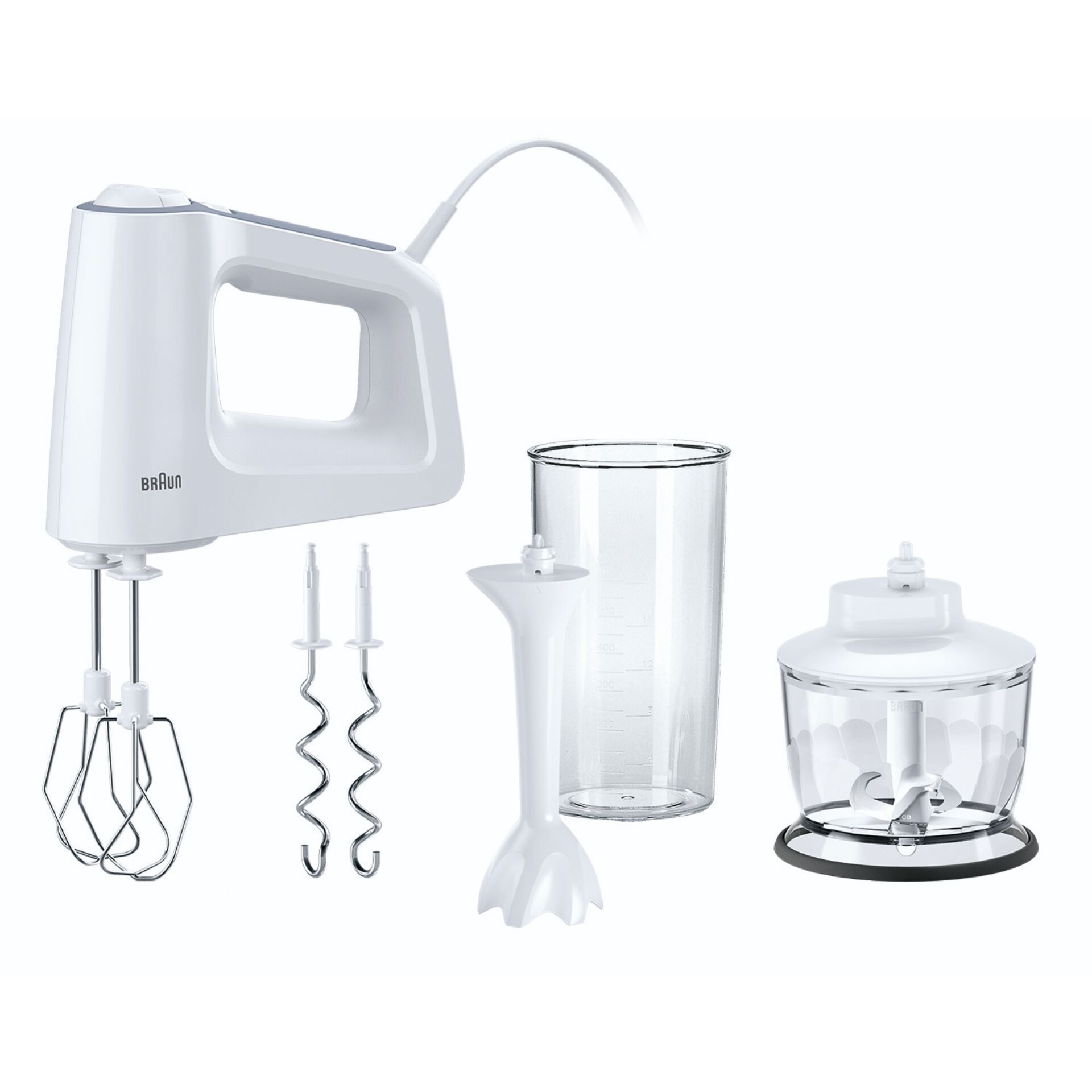 ganchos de amasado, batidor, palo de puré, trituradora, mango ergonómico, área de almacenamiento (soporte estable)