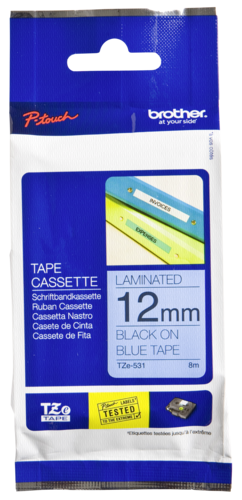 Das laminierte TZe-531 Schriftband mit schwarzer Schrift auf blauem Hintergrund ist optimal zu Hause, im Büro oder an anderen Arbeitsplätzen einsetzbar. Mit ihm können Sie Ordner, Regale, Kabel, USB-Sticks und vieles mehr beschriften.