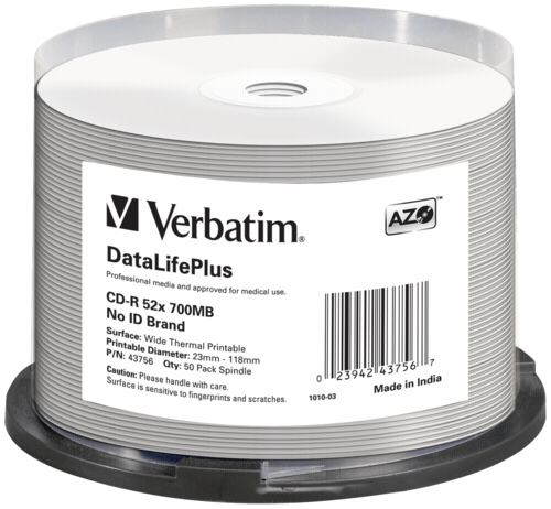 Der Artikel "1x50 Verbatim CD-R 80 / 700MB 52x white wide thermal printable" von der Marke Verbatim vom Typ CD-R und beinhaltet 50 Stück(e) je Packung.