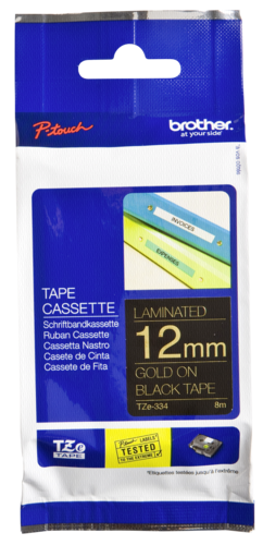 Das laminierte TZe-334 Schriftband mit goldener Schrift auf schwarzem Hintergrund ist optimal zu Hause, im Büro oder an anderen Arbeitsplätzen einsetzbar. Mit ihm können Sie Ordner, Regale, Kabel, USB-Sticks und vieles mehr beschriften.