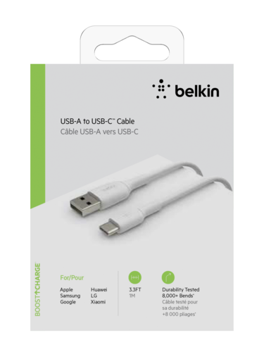Der Artikel "USB-C/USB-A Kabel 1m PVC, weiß CAB001bt1MWH" von der Marke Belkin erhalten Sie mit 1 Stück(e) pro Packung, ist Weiß und hat eine Kabellänge von 1 m.