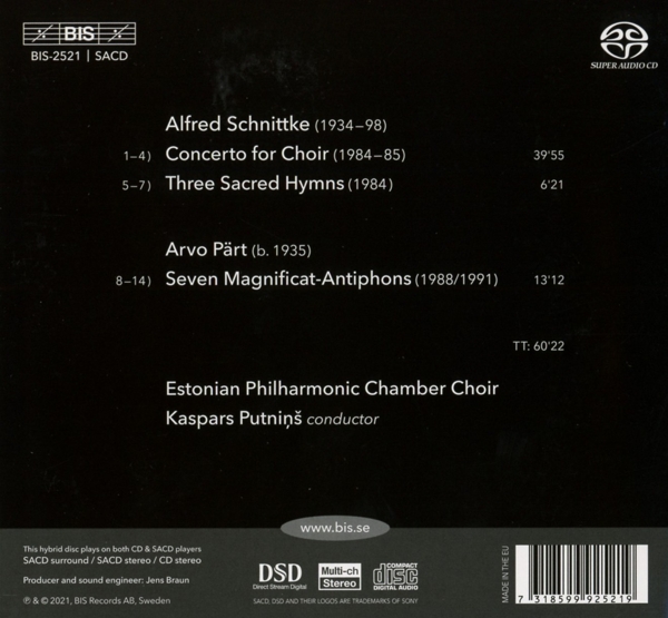 Konzert für Chor (1984-85) 01. "O Pavelitel' sushcheva fsevo (O Meister allen Lebens)" 02. "Sabran'je pesen sikh, gde kazhdyj stikh (Diese Liedersammlung, in der jeder Vers...)" 03. "Fsem tem, kto vniknet fsushchnast' (An alle, die die Bedeutung erfassen)" 04. "Sej trud, shto natchinal ja supavan'jem (Vervollst?ndige dieses Werk, das ich voller Hoffnung begann)" 3 geistliche Hymnen für gemischten Chor (1984) 05. "Nr. 1 Bogoroditse Devo, raduisia (Ave Maria voll der Gnade)" 06. "Nr. 2 Gospodi Isuse Khriste (Herr Jesus)" 07. "Nr. 3 Otche nash (Vater unser)" Magnificat-Antiphonen Nr. 1-7 08. "Nr. 1 O Weisheit" 09. "Nr. 2 O Adonai" 10. "Nr. 3 O Spross aus Isais Wurzel" 11. "Nr. 4 O Schlüssel Davids" 12. "Nr. 5 O Morgenstern" 13. "Nr. 6 O K?nig aller V?lker" 14. "Nr. 7 O Immanuel"