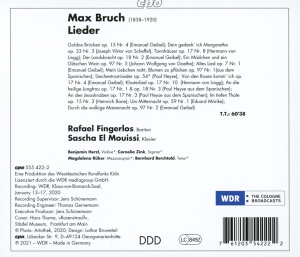 | | Beschreibung: | The first piece composed by Max Bruch during his child prodigy years was a song, and the Five Songs op. 97 number among the last creations with which he closed the files on his long artist's life shortly after World War I. This fact alone would suffice to make us understand the great value attached to song - whether of vocal or instrumental nature - in the oeuvre of this lifelong Romanticist. From the peppy male chorus to the full-length colossal oratorio, from the Loreley to the immortal cantilenas of his Violin Concerto No. 1, Scottish Fantasy, and Kol Nidrei, he sang out his songs to his heart's content while revealing lyrical qualities that come to light in special measure in his collections of solo songs distributed over the entire course of his career - a fact underscored by the Austrian baritone and his piano partner Sascha El Mouissi on this new and so far absolutely unique anthology. Along with delightful tidbits from all of Bruch's compositional periods, we are presenting the five songs from Paul Heyse's novella Siechentrost for One to Four Voice Parts, Violin, and Piano op. 54. Max Bruch's musical setting produced not only an original piece of chamber music but also an intimate look at his self-understanding and his goals. Behind their creator's blustery façade there was also a man of tender, vulnerable character!, Runningtime: 00:00:00, Baritone Vocals: Rafael Fingerlos, Composed By: Max Bruch, Cover: Hans Thoma, Design: Lothar Bruweleit, Engineer: Thomas Gernemann, Executive Producer: Jens Schünemann, Mezzo-soprano Vocals: Magdalena Rüker, Piano: Sascha El Mouissi, Recording Supervisor: Jens Schünemann, Soprano Vocals: Cornelia Zink, Tenor Vocals: Bernhard Berchtold, Violin: Benjamin Herzl, Lyrics By: Emanuel Geibel, Lyrics By: Joseph Victor von Scheffel, Lyrics By: Hermann Lingg, Lyrics By: Emanuel Geibel, Lyrics By: Johann Wolfgang von Goethe, Lyrics By: Emanuel Geibel, Lyrics By: Paul Heyse, Lyrics By: Emanuel Geibel, Lyrics By: Hermann Lingg, Lyrics By: Paul Heyse, Lyrics By: Paul Heyse, Lyrics By: Paul Heyse, Lyrics By: Heinrich Bone, Lyrics By: Eduard Mörike, Lyrics By: Emanuel Geibel, Labelcode CPO555422.2 (555 422-2), Recorded At Klaus-von-Bismarck-Saal, Licensed Through WDR Mediagroup GmbH |  | | Herstellernummer: |