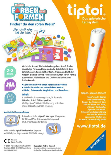 ?tiptoi Meine Farben und Formen? von Ravensburger Sp ist ein interaktives Brettspiel für Kinder ab 3 Jahren zur spielerischen Entdeckung von Farben und Formen. Mit dem innovativen tiptoi-Stift (separat erhältlich) können die Kleinen verschiedene Elemente auf dem Spielbrett erkunden und dabei hören sowie lernen ? jede Berührung wird zum Erlebnis! Das Set enthält hochwertige Spielfiguren aus robusten Materialien für langanhaltenden Spielspaß im Familien- oder Kindergartenalltag. Technische Daten umfassen stabile Kartonkomponenten mit farbenfrohen Illustrationen; das Spiel ist kompatibel mit allen aktuellen tiptoi-Stiften. Es fördert eigenständiges Lernen sowie Feinmotorik-, Sprach-, Konzentrations- und logisches Denkvermögen durch altersgerechte Aufgabenstellungen und Geschichten rund um Farben & Formen. Der Hersteller Ravensburger Sp steht weltweit für qualitativ hochwertiges Lernspielzeug mit hohem pädagogischem Wert ? unter besonderer Berücksichtigung nachhaltiger Produktion: Viele Produkte werden aus Recyclingmaterialien oder Holz aus zertifizierter Forstwirtschaft gefertigt (FSC). Wer dieses Produkt kauft unterstützt somit nicht nur die Entwicklung seines Kindes sondern auch verantwortungsvolle Herstellungsprozesse ? ein wertvoller Beitrag zum Guten!