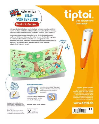 Das ?tiptoi Mein erstes Bild-Wörterbuch Deutsch-Englisch? von Ravensburger ist ein interaktives Lernbuch für Kinder ab 3 Jahren und führt spielerisch an die ersten deutschen und englischen Wörter heran. Mit dem separat erhältlichen tiptoi-Stift können über 1.000 detailreiche Illustrationen angetippt werden ? dabei erklingen authentische Aussprachebeispiele beider Sprachen sowie Geräuscheffekte und Lieder zu Alltagsthemen wie Familie, Tiere oder Zahlen. Die stabilen Pappseiten sind besonders widerstandsfähig gegenüber kleinen Händen und machen das Buch langlebig im täglichen Gebrauch. Das Produkt ist mit allen aktuellen tiptoi-Stiften kompatibel; Audiodateien lassen sich einfach auf der Website von Ravensburger herunterladen. Der Hersteller Ravensburger blickt auf mehr als 135 Jahre Erfahrung zurück und steht weltweit für hochwertige Spiele und Lernprodukte mit hohem pädagogischem Anspruch sowie geprüfter Sicherheit für Kinder jeden Alters. Nachhaltigkeit wird großgeschrieben: Für Bücher wie dieses verwendet das Unternehmen umweltfreundliche Materialien wie FSC-zertifizierte Pappe aus verantwortungsvoller Forstwirtschaft; Produktionsprozesse sind ressourcenschonend gestaltet; Verpackungen bestehen überwiegend aus recycelbaren Stoffen. Mit dem Kauf dieses Bildwörterbuchs fördern Sie nicht nur die Sprachentwicklung Ihres Kindes durch innovatives Lernen ? Sie leisten auch einen aktiven Beitrag zum Umweltschutz und unterstützen nachhaltige Unternehmensführung.