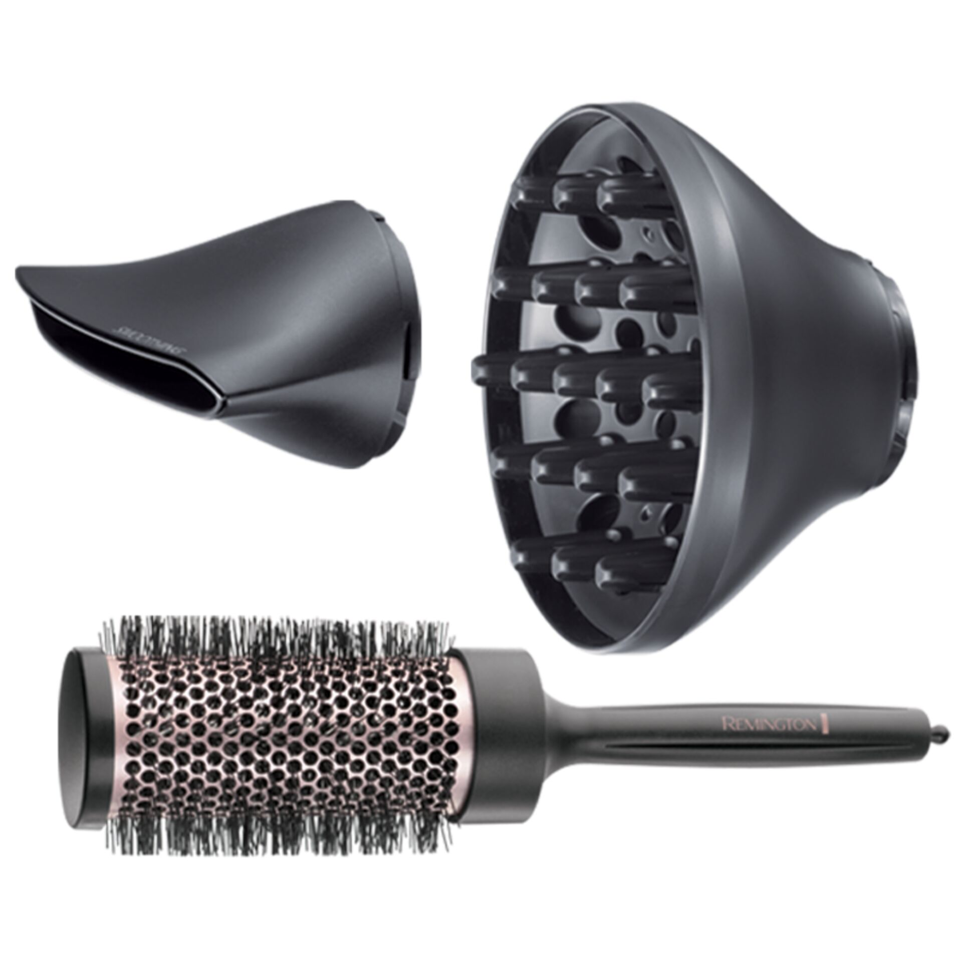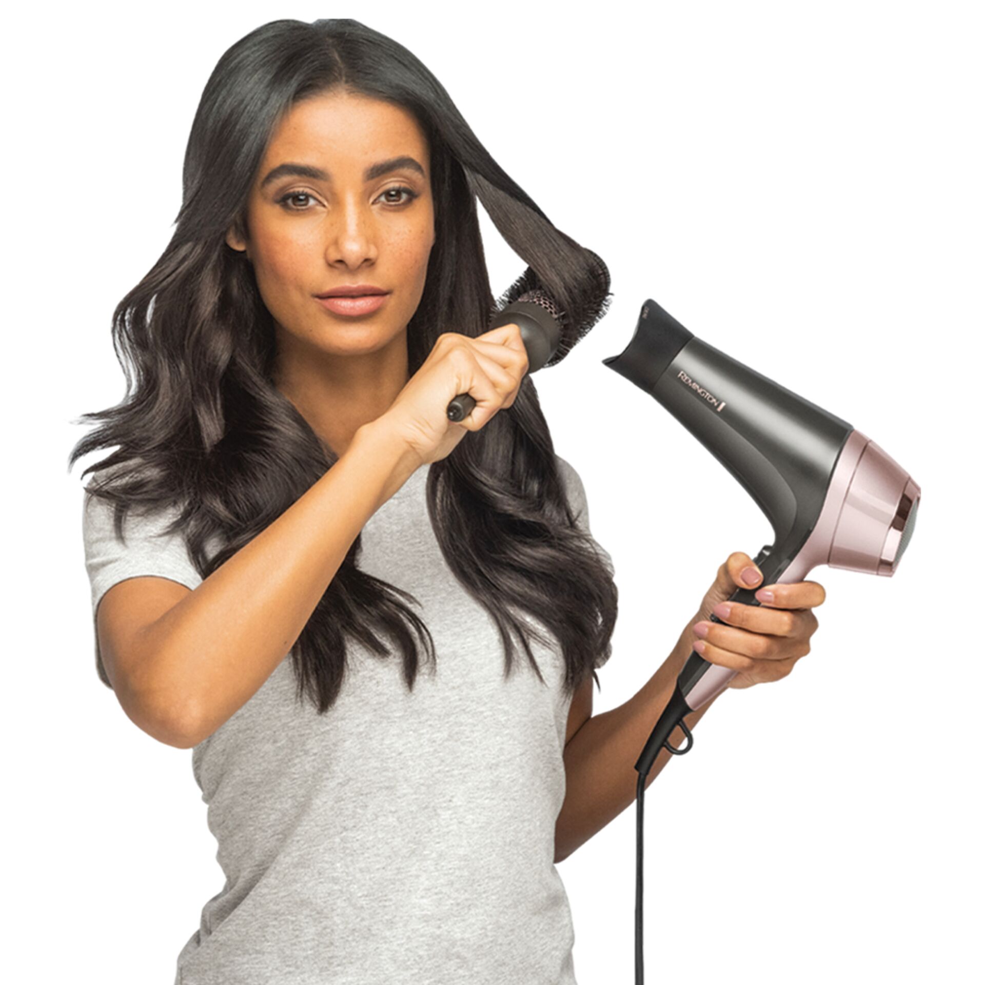 Luft in einer außergewöhnlichen Form, dank des Remington Curl & Straight Confidence Haartrockner. 3 verschiedene Stylingaufsätze sowie eine Rundbürste ermöglichen mit dem Curl & Straight Confidence Haartrockner D5706 den perfekten Blow-Dry-Style ganz einfach zu Hause nachzustylen - wie frisch vom Friseur. Die außergewöhnliche Locken-Stylingdüse von Remington passt sich durch ihre spezielle konkave Form ideal an die der Rundbürste an. Der Luftstrom und die Hitze verteilen sich somit sanft und gleichmäßig entlang der Rundbürste, wodurch weniger Bewegung und Technik notwendig ist - für ein einfacheres Stylen von glamourösen Wellen und Locken mit einem Haartrockner. Wer den Sleek-Look bevorzugt, greift zur extra breiten, flachen Stylingdüse. Durch ihre ergonomisch abgeschrägte Form richtet sich der Luftstrom nach unten und glättet so jede Strähne. Die Breite der Stylingdüse (109 mm) sorgt während des Stylings für mehr Kontakt mit der Bürste und glättet das Haar dadurch besonders effizient und