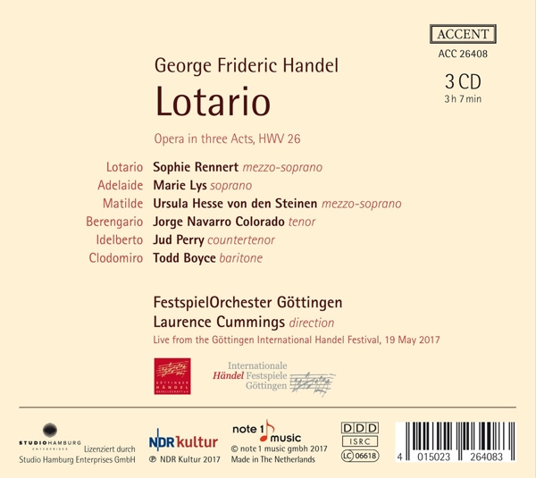 Disc 01 Lotario HWV 26 (Oper in 3 Akten) 01. "Ouvertüre (1. Akt)" 02. "Grave e'l fasto di regnar" 03. "Alto signor, dall'Alpi" 04. "Non pensi quell'altera" 05. "Madre, e reina!" 06. "Vanne a colei che adori" 07. "Finch'io non chiuda" 08. "Per salvarti, idolo mio" 09. "Soglio, degli avi miei retaggio illustre" 10. "Rammentati, cor mio" 11. "Regina, anche fra l'armi" 12. "Se il mar promette calma" 13. "Nel ciel si speri, e poi" 14. "Quel cor che mi donasti" 15. "Oh, del mio caro ben voci gradite" 16. "Gi? mi sembra a carro avvinto" 17. "Adelaide, al passato volgi uno sguardo" 18. "Orgogliosetto va l'auguletto" 19. "Quanto piu fien tenaci" 20. "Scherza in mar navicella"