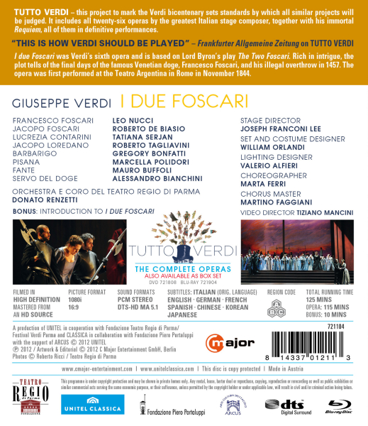01. (keine Angaben) "Vorspann" I due Foscari (Die beiden Foscari, Oper in 3 Akten) (Gesamtaufnahme) 02. Bianchini, Alessandro "Preludio" 03. Bianchini, Alessandro "Silenzio, mistero (1. Akt)" 04. Bianchini, Alessandro "Qui ti rimani alquanto... Brezza del mar natio" 05. Bianchini, Alessandro "Dal pi? remoto esilio" 06. Bianchini, Alessandro "Del Consiglio alla presenza... Odio solo, ed odio atroce" 07. Bianchini, Alessandro "No, mi lasciate!" 08. Bianchini, Alessandro "Tu al cui sguardo onnipossente" 09. Bianchini, Alessandro "Che mi rechi?... O patrizi, tremate!" 10. Bianchini, Alessandro "Tacque il reo" 11. Bianchini, Alessandro "Eccomi solo alfine" 12. Bianchini, Alessandro "O vecchio cor, che batti" 13. Bianchini, Alessandro "L'illustre dama Foscari" 14. Bianchini, Alessandro "Tu pur lo sai" 15. Bianchini, Alessandro "Di sua innocenza dubiti?" 16. Bianchini, Alessandro "Notte, perpetua notte (2. Akt)" 17. Bianchini, Alessandro "Non maledirmi, o prode" 18. Bianchini, Alessandro "Ah, sposo mio!" 19. Bianchini, Alessandro "No, non morrai" 20. Bianchini, Alessandro "Tutta ? calma la laguna" 21. Bianchini, Alessandro "Speranza dolce ancora" 22. Bianchini, Alessandro "Ah, padre!" 23. Bianchini, Alessandro "Nel tuo paterno amplesso" 24. Bianchini, Alessandro "Addio - Parti?" 25. Bianchini, Alessandro "Che pi? si tarda?" 26. Bianchini, Alessandro "O patrizi! Il voleste" 27. Bianchini, Alessandro "Queste innocenti lagrime" 28. Bianchini, Alessandro "Alla gioia, alle corse, alle gare! (3. Akt)" 29. Bianchini, Alessandro "Tace il vento, ? queta l'onda" 30. Bianchini, Alessandro "La giustizia del Leone!" 31. Bianchini, Alessandro "All'infelice veglio" 32. Bianchini, Alessandro "Egli ora parte!" 33. Bianchini, Alessandro "Egli ? spento!" 34. Bianchini, Alessandro "Signor, chiedon parlarti i Dieci" 35. Bianchini, Alessandro "Questa dunque ? l'iniqua mercede" 36. Bianchini, Alessandro "Che venga a me, se lice" 37. Bianchini, Alessandro "Quel bronzo ferale" 38. (keine Angaben) "Applaus" 39. (keine Angaben) "Abspann" 40. (keine Angaben) "Introduction to I due Foscari"