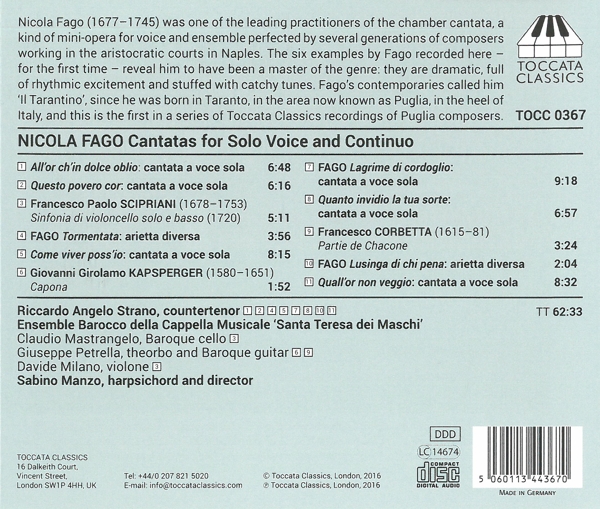 01. Strano, Riccardo Angelo "All'or ch'on dolce oblio (Kantate)" 02. Strano, Riccardo Angelo "Questo povero cor (Kantate)" 03. Manzo, Sabino "Sinfonia für Violoncello und Basso continio" 04. Strano, Riccardo Angelo "Tormentata (Arietta diversa)" 05. Strano, Riccardo Angelo "Come viver poss'io (Kantate)" 06. Manzo, Sabino "Capona" 07. Strano, Riccardo Angelo "Lagrime di cordoglio (Kantate)" 08. Strano, Riccardo Angelo "Quanto invidio la tua sorte (Kantate)" 09. Manzo, Sabino "Partie de Chacone" 10. Strano, Riccardo Angelo "Lusinga di chi pena (Arietta diversa)" 11. Strano, Riccardo Angelo "Quall'or non veggio (Kantate)"