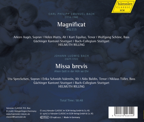 Magnificat D-Dur Wq 215 / H 772 (für Soli, Chor und Orchester) 01. Aug?r, Arleen "Chor: Magnificat anima mea dominum" 02. Aug?r, Arleen "Arie: Quia respexit humilitatem ancillae suae" 03. Aug?r, Arleen "Arie: Quia fecit mihi magna" 04. Aug?r, Arleen "Chor: Et misericordia ejus" 05. Aug?r, Arleen "Arie: Fecit potentiam in brachio suo" 06. Aug?r, Arleen "Duett: Desposuit potentes de sede" 07. Aug?r, Arleen "Arie: Suscepit Israel puerum suum" 08. Aug?r, Arleen "Chor: Gloria patri et filio" 09. Aug?r, Arleen "Chor: Sicut erat in principio" Missa brevis super cantilena Allein Gott in der H?h' sei Ehr (Auszug) 10. Bach-Collegium Stuttgart "Kyrie" 11. Bach-Collegium Stuttgart "Gloria"