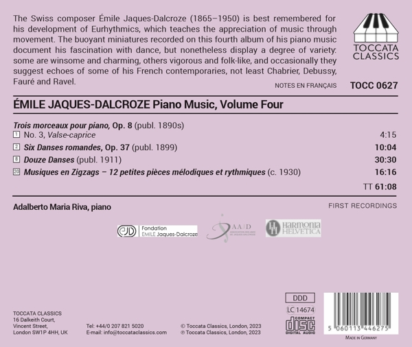 Trois morceaux pour piano op. 8 01. "Nr. 3 Valse-caprice" Six Danses romandes op. 37 02. "Nr. 1 Moderato risoluto" 03. "Nr. 2 Allegretto moderato" 04. "Nr. 3 Allegretto giocoso" 05. "Nr. 4 Tempo di valsa" 06. "Nr. 5 Allegro risoluto" 07. "Nr. 6 Allegretto" Douze Danses 08. "Nr. 1 Allegretto" 09. "Nr. 2 Allegro con ritmo" 10. "Nr. 3 Andante misterioso" 11. "Nr. 4 Moderato grazioso" 12. "Nr. 5 Andante con tenerezza" 13. "Nr. 6 Allegretto quasi Valse lente" 14. "Nr. 7 Allegretto semplice" 15. "Nr. 8 Allegro giocoso" 16. "Nr. 9 Andante tranquillo" 17. "Nr. 10 Allegro risoluto" 18. "Nr. 11 Allegretto" 19. "Nr. 12 Allegro scherzando" Musiques en Zigzags - 12 petites pi?ces m?lodiques et rythmiques 20. "Nr. 1 Na?vement" 21. "Nr. 2 Vif et fort" 22. "Nr. 3 Avec une candeur d'autrefois" 23. "Nr. 4 Commod?ment et avec un sourire satisfait" 24. "Nr. 5 Avec h?sitation" 25. "Nr. 6 D'un ton "bon enfant"" 26. "Nr. 7 Avec une pesanteur obstin?e" 27. "Nr. 8 Avec tendresse et m?lancholie" 28. "Nr. 9 Mouvement de valse" 29. "Nr. 10 Rude et incisif" 30. "Nr. 11 Lent, avec quelques sautes d'humeur" 31. "Nr. 12 Avec un brio ?tincelant"