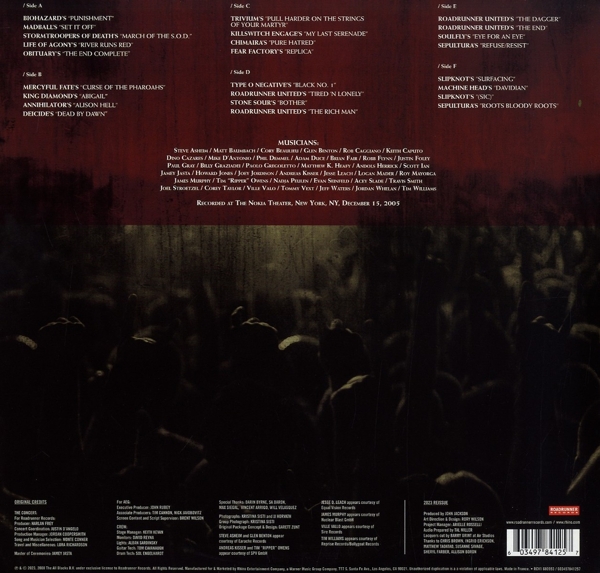 Beschreibung:The Concert (Live at the Nokia Theatre, New York, NY, 12/15/2005) - Triple vinyl LP pressing. We have opened the vault to bring to you Roadrunner United 'The Concert (Live at the Nokia Theatre, New York, NY, 12/15/2005)', featuring members of Slipknot, Anthrax, Trivium, Machine Head, Fear Factory, Sepultura & more. Roadrunner United was a project organized by the heavy metal record label Roadrunner Records to celebrate it's 25th anniversary. On December 15th, 2005, in New York City, Roadrunner Records produced the Metal Concert to end all Metal Concerts: 39 musicians, representing 25 different Roadrunner bands, performed 25 songs from 19 different bands' repertoire. This unique and unprecedented aggregation of musicians was no jam session. Each song was studiously rehearsed and arranged, coming together with exuberant perfection, to produce a concert that can only be called "Legend." Conceived as a follow-up to the Roadrunner United All-Star recording sessions, the label recruited the core team of musicians (Dino Cazares, Adam Duce, Paul Gray, Joey Jordison, Andreas Kisser and Roy Mayorga) as the backbone of the performance. Sure enough, as they fine-tuned the songs and rehearsed them tirelessly, dozens of other musicians came on board. This set represents the gathering of a community of musicians that spans the heavy metal history of the first 25 years of Roadrunner Records: from King Diamond to Slipknot and beyond. Those who were lucky enough to be there experienced a night they will never forget. For the first time as a live concert album, this set is a chance to relive that special night again and again., Runningtime: 00:00:00, Art Direction, Design [2023 Reissue]: Rory Wilson, Lacquer Cut By [2023 Reissue]: Barry Grint, Producer [2023 Reissue]: John Jackson (2), Project Manager [2023 Reissue]: Arielle Rosselli, Bass: Adam Duce, Drums: Joey Jordison, Lead Guitar: Andreas Kisser, Rhythm Guitar: Dino Cazares, Vocals: Evan Seinfeld, Vocals, Rhythm Guitar: Billy Graziadei, Written-By: Biohazard, Bass: Adam Duce, Drums: Joey Jordison, Rhythm Guitar: Andreas Kisser, Rhythm Guitar: Dino Cazares, Vocals: Jamey Jasta, Written-By: Madball, Bass: Paul Gray (3), Drums: Joey Jordison, Lead Guitar: Andreas Kisser, Rhythm Guitar: Dino Cazares, Rhythm Guitar: Scott Ian, Vocals: Keith Caputo, Written-By: Stormtroopers Of Death, Bass: Paul Gray (3), Drums: Joey Jordison, Lead Guitar: Andreas Kisser, Rhythm Guitar: Dino Cazares, Rhythm Guitar: Scott Ian, Vocals: Keith Caputo, Written-By: Life Of Agony, Bass: Paul Gray (3), Drums: Joey Jordison, Lead Guitar: Andreas Kisser, Rhythm Guitar: Dino Cazares, Vocals: Glen Benton, Written-By: Obituary, Bass: Adam Duce, Drums: Joey Jordison, Lead Guitar: Andreas Kisser, Lead Guitar: James Murphy (2), Vocals: Ripper Owens, Written-By: Mercyful Fate, Bass: Paul Gray (3), Drums: Roy Mayorga, Keyboards: Rob Caggiano, Lead Guitar: James Murphy (2), Lead Guitar: Jeff Waters, Vocals: Ripper Owens, Written-By: King Diamond, Bass: Adam Duce, Drums: Roy Mayorga, Lead Guitar: James Murphy (2), Lead Guitar: Jeff Waters, Vocals: Ripper Owens, Written-By: Annihilator (2), Bass: Paul Gray (3), Drums: Steve Asheim, Lead Guitar: Andreas Kisser, Rhythm Guitar: Dino Cazares, Vocals: Glen Benton, Written-By: Deicide, Bass, Vocals: Paulo Gregoletto, Drums: Travis Smith, Lead Guitar, Vocals: Corey Beaulieu, Vocals: Robert Flynn, Vocals, Lead Guitar: Matt Heafy, Written-By: Trivium, Bass: Mike D'Antonio, Drums: Justin Foley, Rhythm Guitar: Andreas Kisser, Rhythm Guitar: Joel Stroetzel, Vocals: Howard Jones (2), Vocals: Jesse David Leach, Written-By: Killswitch Engage, Bass: Adam Duce, Drums: Joey Jordison, Rhythm Guitar: Andreas Kisser, Rhythm Guitar: Dino Cazares, Vocals: Jamey Jasta, Written-By: Chimaira, Bass: Adam Duce, Drums: Joey Jordison, Rhythm Guitar: Andreas Kisser, Rhythm Guitar: Dino Cazares, Vocals: Matt Heafy, Written-By: Fear Factory, Bass: Nadja Peulen, Drums: Joey Jordison, Keyboards: Rob Caggiano, Lead Guitar: Andreas Kisser, Rhythm Guitar, Vocals: Dino Cazares, Vocals: Ville Valo, Written-By: Type O Negative, Bass: Nadja Peulen, Drums: Joey Jordison, Keyboards: Rob Caggiano, Lead Guitar: Matt Baumbach, Rhythm Guitar: Acey SLade, Vocals: Keith Caputo, Written-By: Roadrunner United, Guitar, Vocals: Corey Taylor, Vocals: Keith Caputo, Written-By: Stone Sour, Bass: Paul Gray (3), Drums: Andols Herrick, Rhythm Guitar: Jeff Waters, Rhythm Guitar: Jordan Whelan, Vocals: Corey Taylor, Written-By: Roadrunner United, Bass: Paul Gray (3), Drums: Andols Herrick, Lead Guitar: Jeff Waters, Rhythm Guitar: Adam Duce, Rhythm Guitar: Andreas Kisser, Rhythm Guitar: Jordan Whelan, Vocals: Howard Jones (2), Vocals: Robert Flynn, Written-By: Roadrunner United, Bass: Nadja Peulen, Drums: Roy Mayorga, Rhythm Guitar: Dino Cazares, Rhythm Guitar: Logan Mader, Vocals: Matt Heafy, Written-By: Roadrunner United, Bass: Adam Duce, Drums: Roy Mayorga, Lead Guitar: Logan Mader, Rhythm Guitar: Dino Cazares, Vocals: Brian Fair, Written-By: Soulfly, Bass: Adam Duce, Drums: Roy Mayorga, Lead Guitar: Andreas Kisser, Rhythm Guitar: Dino Cazares, Rhythm Guitar: Phil Demmel, Rhythm Guitar: Scott Ian, Vocals: Robert Flynn, Written-By: Sepultura, Bass: Adam Duce, Drums: Roy Mayorga, Rhythm Guitar: Andreas Kisser, Rhythm Guitar: Dino Cazares, Vocals: Robert Flynn, Written-By: Slipknot, Bass: Paul Gray (3), Drums: Joey Jordison, Lead Guitar: Andreas Kisser, Lead Guitar: Logan Mader, Rhythm Guitar: Dino Cazares, Vocals: Matt Heafy, Vocals: Robert Flynn, Vocals: Tim Williams (2), Written-By: Machine Head (3), Bass: Paul Gray (3), Drums: Joey Jordison, Rhythm Guitar: Andreas Kisser, Rhythm Guitar: Dino Cazares, Rhythm Guitar: Scott Ian, Vocals: Corey Taylor, Vocals: Tommy Vext, Written-By: Slipknot, Bass: Adam Duce, Bass: Paul Gray (3), Drums: Joey Jordison, Lead Guitar: Andreas Kisser, Percussion: Roy Mayorga, Rhythm Guitar: Dino Cazares, Rhythm Guitar: Scott Ian, Vocals: Robert Flynn, Vocals [Addit