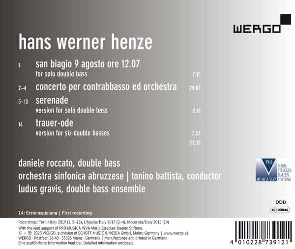 Beschreibung:Hans Werner Henze was during his lifetime probably the most-performed composer of western modern music, and his advanced yet sensuously traditional music remains an important presence on stages around the world today. Henze was deeply attached to Italy, where he spent a large part of his life. The roots of this album go back to a personal meeting between Henze and the Italian double bass virtuoso Daniele Roccato when Roccato was attempting to obtain Henze's blessing for a theater piece about the composer's friendship and correspondence with Ingeborg Bachmann. For the occasion, Roccato organized a private performance of his own arrangement (for the six bass players of the Ludus Gravis ensemble) of Henze's "Trauer-Ode", which had originally been composed for cellos. Henze was so pleased with the new version of the piece that he added it to his list of published works. This recording includes "Trauer-Ode" for six double basses, as well as two solo works for bass, "Serenade" and "San Biagio 9 Agosto ore 12.07". But the highpoint of the album is Daniele Roccato's performance of Hans Werner Henze's "Concerto per Contrabbasso ed Orchestra": the piece was a milestone in the history of the double bass that expanded the technical and expressive possibilities of the instrument - and has become an essential part of the standard repertoire for young soloists. Roccato's deep and personal approach to the music makes this album a "must-have" not only for double bass aficionados, but anyone interested in the music of Hans Werner Henze., Runningtime: 00:00:00, Labelcode WER73912.2