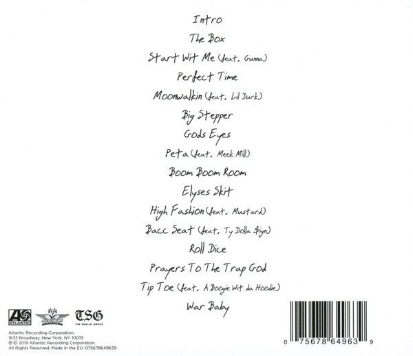 01. Ricch, Roddy "Intro" 02. Ricch, Roddy "The box" 03. Roddy Ricch / Gunna "Start wit me" 04. Ricch, Roddy "Perfect time" 05. Roddy Ricch / Lil Durk "Moonwalkin" 06. Ricch, Roddy "Big stepper" 07. Ricch, Roddy "Gods eyes" 08. Roddy Ricch / Meek Mill "Peta" 09. Ricch, Roddy "Boom boom room" 10. Ricch, Roddy "Elyses [Skit]" 11. Roddy Ricch / Mustard "High fashion" 12. Roddy Ricch / Ty Dolla $ign "Bacc Seat" 13. Ricch, Roddy "Roll dice" 14. Ricch, Roddy "Prayers to the trap God" 15. Roddy Ricch / A Boogie Wit Da Hoodie "Tip toe" 16. Ricch, Roddy "War baby"