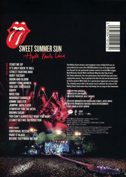 01. "Act One (Live In Hyde Park, United Kingdom / 2013)" 02. "Start Me Up (Live In Hyde Park, United Kingdom / 2013)" 03. "It's Only Rock 'N' Roll (But I Like It) (Live In Hyde Park, United Kingdom / 2013)" 04. "Street Fighting Man (Live In Hyde Park, United Kingdom / 2013)" 05. "Ruby Tuesday (Live In Hyde Park, United Kingdom / 2013)" 06. "Doom And Gloom (Live In Hyde Park, United Kingdom / 2013)" 07. "Act Two (Live In Hyde Park, United Kingdom / 2013)" 08. "Honky Tonk Women (Live In Hyde Park, United Kingdom / 2013)" 09. "You Got The Silver (Live In Hyde Park, United Kingdom / 2013)" 10. "Happy (Live In Hyde Park, United Kingdom / 2013)" 11. "Miss You (Live In Hyde Park, United Kingdom / 2013)" 12. "Act Three (Live In Hyde Park, United Kingdom / 2013)" 13. "Midnight Rambler (Live In Hyde Park, United Kingdom / 2013)" 14. "Gimme Shelter (Live In Hyde Park, United Kingdom / 2013)" 15. "Jumpin' Jack Flash (Live In Hyde Park, United Kingdom / 2013)" 16. "Sympathy For The Devil (Live In Hyde Park, United Kingdom / 2013)" 17. "Brown Sugar (Live In Hyde Park, United Kingdom / 2013)" 18. "You Can't Always Get What You Want (Live In Hyde Park, United Kingdom / 2013)" 19. "Act Four (Live In Hyde Park, United Kingdom / 2013)" 20. "(I Can't Get No) Satisfaction (Live In Hyde Park, United Kingdom / 2013)" 21. "Credits (Live In Hyde Park, United Kingdom / 2013)" 22. "Menu / The Rolling Stones / Sweet Summer Sun - Hyde Park Live" 23. "Emotional Rescue (Live In Hyde Park, United Kingdom / 2013)" 24. "Paint It Black (Live In Hyde Park, United Kingdom / 2013)" 25. "Before They Make Me Run (Live In Hyde Park, United Kingdom / 2013)"