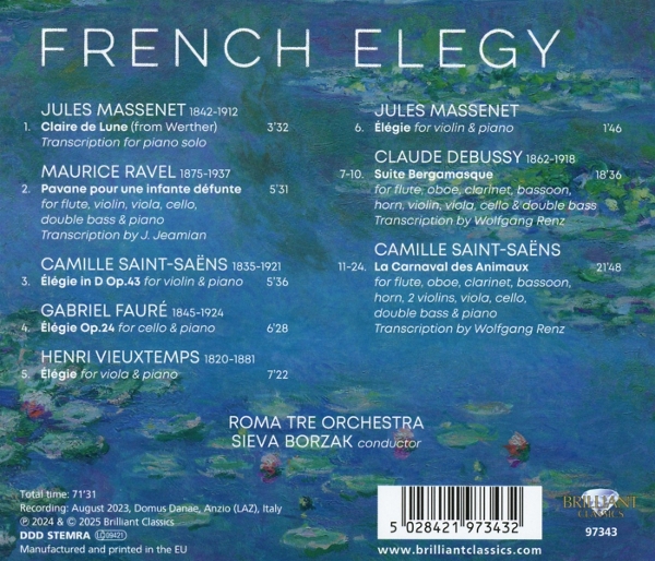 Werther (Oper in 4 Akten) (Auszug) 01. Barison, Beatrice "Claire de lune (transkr. für Klavier solo)" 02. Grieco, Marta Lorenza "Pavane pour une Infante d?funte für Fl?te, Violine, Viola, Violoncello, Kontrabass und Klavier (bearb. von J. Jeamian)" 03. Papandrea, Elisa Eleonora "l?gie für Violine und Klavier D-Dur op. 143" 04. Guaitolini, Alessandro "l?gie c-moll op. 24 (für Violoncello und Klavier)" 05. Borzak, Sieva "l?gie op. 30 (für Viola und Klavier)" 06. Borzak, Sieva "l?gie op. 10 (für Violine und Klavier)" Suite bergamasque für Fl?te, Oboe, Klarinette, Fagott, Horn und Streicher (bearb. von Wolfgang Renz) 07. Borzak, Sieva "1. Prelude" 08. Borzak, Sieva "2. Menuett" 09. Borzak, Sieva "3. Claire de lune" 10. Borzak, Sieva "4. Passepied" Der Karneval der Tiere (Le Carnaval des animaux) (bearb. von Wolfgang Renz) 11. Borzak, Sieva "1. Introduktion - Marche royale du lion" 12. Borzak, Sieva "2. Poules et coqs" 13. Borzak, Sieva "3. H?miones (animaux v?loces)" 14. Borzak, Sieva "4. Tortues" 15. Borzak, Sieva "5. l?phantes" 16. Borzak, Sieva "6. Kangourous" 17. Borzak, Sieva "7. Aquarium" 18. Borzak, Sieva "8. Personnages ? longues oreilles" 19. Borzak, Sieva "9. Le coucou au fond des bois" 20. Borzak, Sieva "10. Voli?re" 21. Borzak, Sieva "11. Pianistes" 22. Borzak, Sieva "12. Fossiles" 23. Borzak, Sieva "13. Cygne" 24. Borzak, Sieva "14. Finale"