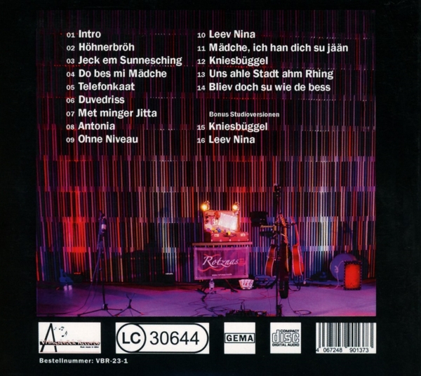 01. "Intro (Live Aus Der Immanuel-Kirche)" 02. "H?hnerbr?h (Live Aus Der Immanuel-Kirche)" 03. "Jeck em Sunnesching (Live Aus Der Immanuel-Kirche)" 04. "Do bes mi M?dche (Live Aus Der Immanuel-Kirche)" 05. "Telefonkaat (Live Aus Der Immanuel-Kirche)" 06. "Duvedriss (Live Aus Der Immanuel-Kirche)" 07. "Met minger Jitta (Live Aus Der Immanuel-Kirche)" 08. "Antonia (Live Aus Der Immanuel-Kirche)" 09. "Ohne Niveau (Live Aus Der Immanuel-Kirche)" 10. "Leev Nina (Live Aus Der Immanuel-Kirche)" 11. "M?dche, ich hab dich su j??n (Live Aus Der Immanuel-Kirche)" 12. "Kniesbüggel (Live Aus Der Immanuel-Kirche)" 13. "Uns ahle Stadt ahm Rhing (Live Aus Der Immanuel-Kirche)" 14. "Bliev doch su wie de bess (Live Aus Der Immanuel-Kirche)" 15. "Kniesbüggel" 16. "Leev Nina"