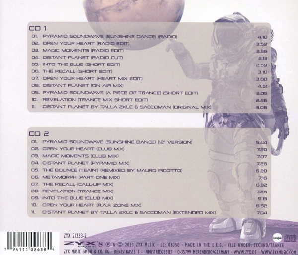 Disc 02 01. SACCOMAN "PYRAMID SOUNDWAVE (SUNSHINE DANCE), (12" Version)" 02. SACCOMAN "OPEN YOUR HEART, (Club Mix)" 03. SACCOMAN "MAGIC MOMENTS, (Club Mix)" 04. SACCOMAN "DISTANT PLANET, (Pyramid Mix)" 05. SACCOMAN "THE BOUNCE (TEAIN ), (Remixed by Mauro Picotto)" 06. SACCOMAN "METAMORPH, (Part One Mix)" 07. SACCOMAN "THE RECALL, (Call-Up Mix)" 08. SACCOMAN "REVELATION, (Trance Mix)" 09. SACCOMAN "INTO THE BLUE, (Club Mix)" 10. SACCOMAN "OPEN YOUR HEART, (R.A.F. Zone Mix)" 11. TALLA 2XLC & SACCOMAN "DISTANT PLANET, (Extended Mix)"