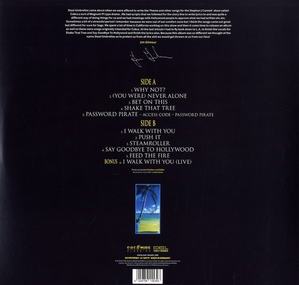 | | Beschreibung: | Art Direction [Original Artwork], Design [Original Artwork]: Vivid Images, Backing Vocals: Fred White (2), Backing Vocals: Paula Mattioli, Backing Vocals: Stu Saddoris, Bass: Jim Crichton, Cover [Original Front Cover Concept By], Design Concept [Original Front Cover Concept By], Photography By [Original Front Cover Photography By]: Penny Crichton, Cover [Original Front Cover Image]: Ioannis (2), Cover [Original Front Cover Image]: Stephen Jacaruso, Cover [Original Front Cover Image]: Vivid Images, Design [Reissue Design By]: Alexander Mertsch, Design [Steel Umbrellas By]: Heidi Coyle, Drums, Percussion: Steve Negus, Engineer [Recording Engineer Keyboards]: Steve Negus, Engineer [Recording Engineer]: Jim Crichton, Guitar: Ian Crichton, Illustration [Re-illustrated In 2021 By]: Gyula Havancsak, Keyboards: Jim Gilmour, Lacquer Cut By: Heino Leja, Liner Notes: Jim Gilmour, Liner Notes: Matthias Mineur, Mastered By [Digital Mastering By]: Eddy Schreyer, Mastered By [Mastered For Vinyl By], Remastered By: Eike Freese, Mixed By: Mike Ging, Producer: Jim Crichton, Producer: Saga (3), Vocals: Michael Sadler, Written-By: Craig Van Sickle, Written-By: Gerald O'Brien, Written-By: Ian Crichton, Written-By: Jim Crichton, Written-By: Jim Gilmour, Written-By: Michael Sadler, Written-By: Saga (3), Written-By: Steve Mitchell (2), Written-By: Steve Negus, Labelcode ERMU215539.1 (0215539EMU), Record Company Ear Music Classics, Phonographic Copyright (p) Edel Germany GmbH, Copyright (c) Edel Germany GmbH, Published By Black Hole Publishing, Published By Grand H Music, Published By Cherry Lane Music Publishing Company Inc., Published By Cherry River Music Co., Recorded At Sound Image Studios, Mixed At Sound Image Studios, Mastered At Future Disc, Remastered At Chameleon Recording Studios Hamburg, Made By Optimal Media GmbH, Lacquer Cut At Optimal Media GmbH, Pressed By Optimal Media GmbH |  | | Spielzeit: |