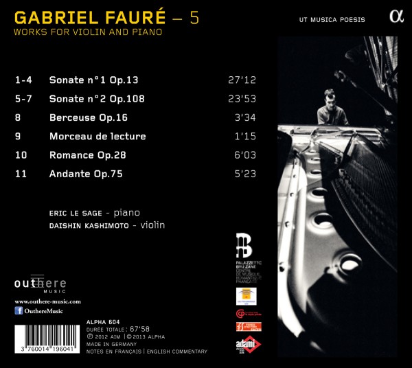 | Beschreibung: | Fifth and final volume of Alpha's Faure chamber music series. French master composer and pedagogue whose harmonic advancements greatly influenced later generations of composers, including those of the famed 'Les Six'. Renowned pianist Eric Le Sage completed an internationally acclaimed Robert Schumann cycle for Alpha in 2010. Violinist Daishin Kashimoto is presently concertmaster of the Berlin Philharmonic Orchestra. Mr. Le Sage and Mr. Kashimoto have collaborated often in concert., Runningtime: 00:00:00, Co-producer [Chargée D'édition]: Pauline Pujol, Composed By: Gabriel Fauré, Engineer [Prise De Son], Edited By [Montage], Mastered By [Mastering], Producer [Direction Artistique]: Jean-Marc Laisné, Graphics [Graphisme]: Gaëlle Löchner, Liner Notes: Nicolas Southon, Liner Notes [Translted By]: Vanina Géré, Photography By [Photographie Couverture]: Jean-Baptiste Millot, Photography By [Photographie Livret]: Vincent Sannier, Piano [Steinway D]: Éric Le Sage, Producer [Direction Artistique Alpha Productions]: Julien Dubois (3), Technician [Accord Piano Steinway D]: Cyril Mordant, Violin: Daishin Kashimoto, Labelcode ALPP604.2 (ALPHA 604), Phonographic Copyright (p) AIM (12), Copyright (c) Alpha Productions, Recorded At La Salle Philharmonique De Liège, Glass Mastered At Arvato |