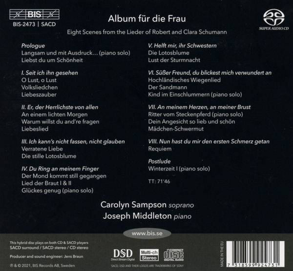 Beschreibung:For the first four years of their marriage, Robert and Clara Schumann kept a joint diary, a project which Robert described as 'a record of our wishes and our hopes, and the means whereby we may convey to one another any requests we may have to make, for which words may not suffice...' In the imaginative recital Album für die Frau, Carolyn Sampson and Joseph Middleton combine songs by both composers into something similar - the depiction of a relationship seen through the eyes of both parties. Using the eight songs from Robert's song cycle Frauenliebe und -leben to poems by Adalbert von Chamisso as the framework, they add songs as well as some piano solos in order to create a fuller and more complex picture. The result seems to suggest that the experiences of our 'Frau' are richer than Chamisso and Robert Schumann imagined: while love, marriage and motherhood dominated much of Clara Schumann's life, Robert's death in 1856 signaled the start of a four-decade widowhood during which she resumed her stellar career as a pianist. As a team, Carolyn Sampson and Joseph Middleton have released a number of acclaimed discs, including 'Fleurs', featuring flower-themed songs by composers from Purcell to Richard Strauss and Britten, 'A Verlaine Songbook', exploring settings of the poetry of Paul Verlaine, and 'A Soprano's Schubertiade', a Schubert anthology., Runningtime: 00:00:00, Labelcode BIS2473SACD