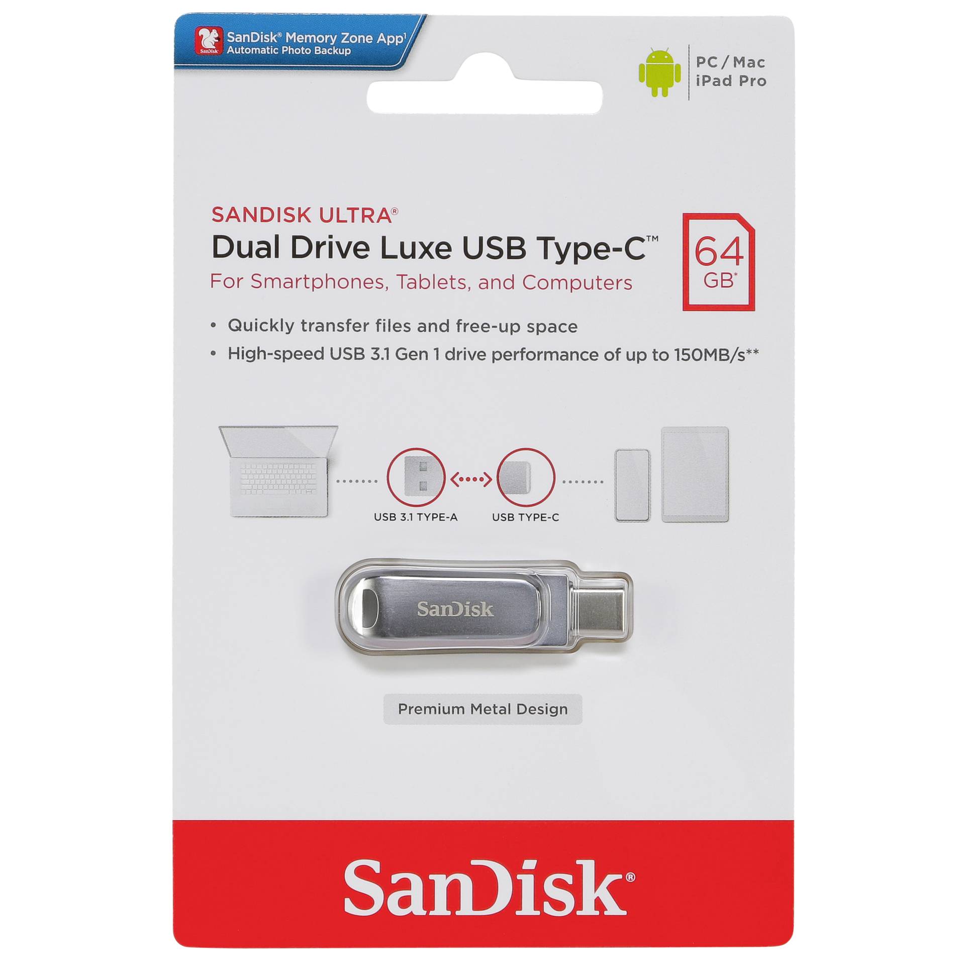 Der Artikel "Ultra Dual Drive Luxe 64 GB, USB-Stick" von der Marke Sandisk beinhaltet 1 Stück(e) je Packung, ist aus Metall und hat die Farbe Edelstahl.