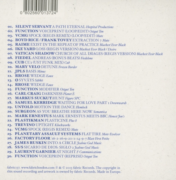Beschreibung:DJ Mix, Producer: Sandwell District, Mastered By: Dave Turner, Written-By: Karl O'Connor, Written-By, Producer: Juan Mendez, Composed By, Producer: David Sumner, Composed By: Martin L. Gore, Composed By: Vince Clarke, Remix: Regis, Composed By: Boyd Rice, Composed By: Frank Tovey, Written-By, Producer: Joe Andrews (3), Written-By, Producer: Tom Halstead (2), Producer: Ike Yard, Remix [Additional Remix & Production]: Karl O'Connor, Written-By: Fred Szymanski, Written-By: Kenneth Compton, Written-By: Michael Diekmann, Written-By: Stuart Argabright, Remix [Additional Remix & Production]: Karl O'Connor, Written-By, Producer: Dominick Fernow, Written-By, Producer: Michael Fiedler (3), Producer: Mick Harris (2), Remix [Uncredited]: Ugandan Speed Trials, Written-By: Cub (5), Written-By, Producer: Mary Velo, Written-By, Producer: Jeremy Jacobs, Written-By, Producer: Rrose, Written-By, Producer: Mika Vainio, Written-By, Producer: Rrose, Composed By, Producer: David Sumner, Written-By, Producer: Carl Craig, Written-By, Producer: Markus Suckut, Written-By, Producer: Samuel Kerridge, Written-By, Producer: Jack Dunning, Producer: Enrique Mena, Written-By: Anthony Child, Music By [Elements]: BBC (3), Written-By: Richard Mthetwa, Written-By, Producer: Mark Ernestus, Composed By, Producer: Richie Hawtin, Written-By, Producer: Trevino, Composed By: Martin L. Gore, Composed By: Vince Clarke, Written-By, Producer: Luke Slater, Written-By, Producer: Dominic Butler, Written-By, Producer: James Ruskin, Written-By, Producer: Enrique Mena, Written-By, Producer: Juan Mendez, Producer: DJ Marky & XRS, Written-By: Laurent Garnier, Composed By, Producer: David Sumner, Labelcode FABR137.2 (fabric137)