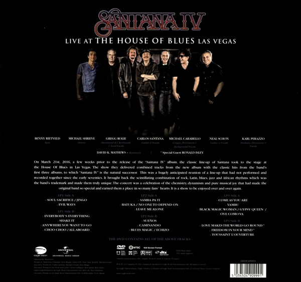 | | Beschreibung: | Artwork [Cover], Design: Heather Griffin-Vine, Artwork [Cover], Design: Richard Nelson (13), Bass: Benny Rietveld, Cameraman [Camera]: Daniel McNerney, Cameraman [Camera]: Dave McAteer, Cameraman [Camera]: Ivan Rodriguez (6), Cameraman [Camera]: Jeremy Settles, Cameraman [Camera]: Marcie Collins, Cameraman [Camera]: Randy Farrow, Cameraman [Camera]: Sam Grace (2), Cameraman [Camera]: Scott McLain (2), Congas, Percussion, Backing Vocals: Michael Carabello, Crew [Tour Assistant]: Sean Guthrie, Design [Booklet]: Cürt Evans, Design [Booklet]: James McAllister (3), Design [Video Designer / Director]: Bob Higgins (4), Drums: Michael Shrieve, Engineer [Audio Assist]: Josh Conway, Engineer [Audio Assist]: Tony Kremer, Engineer [Engineer In Charge]: Steve Ellis (4), Engineer [FOH]: Rob Mailman, Engineer [Monitor]: Brian Montgomery, Executive-Producer: Carlos Santana, Executive-Producer: Don Maggi, Executive-Producer: Michael Vrionis, Executive-Producer [For Eagle Rock]: Geoff Kempin, Executive-Producer [For Eagle Rock]: Terry Shand (3), Executive-Producer [For Front And Center]: Denis Gallagher, Executive-Producer [For Front And Center]: Ken Sturm, Executive-Producer [For Front And Center]: Ron Sturm, Film Director [Associate Director]: Jim Fagan (2), Film Director, Producer, Post Production: Brad Fuss, Film Editor [Editor]: Iris Wall, Film Editor [Senior Editor]: Ashley Maas, Guitar, Vocals: Carlos Santana, Guitar, Vocals: Neal Schon, Keyboards: David K. Mathews, Keyboards, Lead Vocals, Organ [Hammond B3]: Gregg Rolie, Lighting Director: John Marovich, Lighting Director: Michael Ledesma (2), Liner Notes: Hal Miller (2), Management: Adam Fells, Management: Chris McNair, Management: Maria Vrionis, Management: Michael Vrionis, Management: Micki Alboff, Management: Steven Vrionis, Management [Line Producer]: Deni Graap, Management [Personal Assistant]: Chad Wilson (3), Management [Road Manager]: Libby Fabro, Management [Technical Manager]: Gary Shinn (2), Photography By: Erik Kabik, Producer: Adam Fells, Producer: Christine Davis Regan, Producer: Michael Jensen, Producer [Associate]: Kristy Geslain, Producer, Tour Manager [Tour Director]: Paul Rickert, Production Manager: Mike Keifer, Recorded By [Assistant, Audio], Mixed By [Assistant, Audio], Mastered By [Assistant, Audio]: Benny Rietveld, Recorded By [Assistant, Audio], Mixed By [Assistant, Audio], Mastered By [Assistant, Audio]: Michael Shrieve, Recorded By [Audio], Mixed By [Audio], Mastered By [Audio]: Jim Reitzel, Stage Manager: Sharon Singer, Supervised By [Supervising Producers For Eagle Rock]: Matt Friedman, Supervised By [Supervising Producers For Eagle Rock]: Rob Gill, Technician [Audio]: Anthony Silipigon, Technician [Audio]: Matt Anderson (3), Technician [Bass]: Jason Kendall (3), Technician [Congas]: Tony Radogna, Technician [Drums]: Jeff Ocheltree, Technician [Guitar, Carlos Santana]: Ed Adair, Technician [Guitar, Neal Schon]: Bobby Schneck, Technician [Keyboard]: Mike McGowan (6), Technician [Percussion]: Chad Tasky, Technician [Stage]: Chris McNair, Technician [Technical Director]: Wladymr Jean-Mary, Timbales, Percussion, Vocals: Karl Perazzo, Written-By [Jingo]: Babatunde Olatunji, Written-By [Soul Sacrifice]: Carlos Santana, Written-By [Soul Sacrifice]: David Brown (5), Written-By [Soul Sacrifice]: Gregg Rolie, Written-By [Soul Sacrifice]: Marcus Malone, Written-By: Clarence Henry, Written-By: Carlos Santana, Written-By: Gregg Rolie, Written-By: Michael Shrieve, Written-By: Milton Brown (3), Written-By: Tyrone Moss, Written-By: Gregg Rolie, Written-By: Karl Perazzo, Written-By: Michael Carabello, Written-By: Neal Schon, Written-By: Gregg Rolie, Written-By: Carlos Santana, Written-By [Choo Choo]: Gregg Rolie, Written-By [Choo Choo]: Michael Carabello, Written-By [Choo Choo]: Neal Schon, Written-By [Choo Choo]: ????? ????, Written-By: Carlos Santana, Written-By: Gregg Rolie, Written-By: Michael Carabello, Written-By [Batuka]: Carlos Santana, Written-By [Batuka]: David Brown (5), Written-By [Batuka]: José "Chepito" Areas, Written-By [Batuka]: Michael Shrieve, Written-By [No One To Depend On]: Coke Escovedo, Written-By: Carlos Santana, Written-By: Gregg Rolie, Written-By: Michael Shrieve, Written-By: Benny Rietveld, Written-By: Carlos Santana, Written-By: Carlos Santana, Written-By: Karl Perazzo, Written-By: Michael Carabello, Written-By: Neal Schon, Written-By: Neal Schon, Written-By [Blues Magic]: Carlos Santana, Written-By [Blues Magic]: Gregg Rolie, Written-By [Echizo]: Michael Shrieve, Written-By: Carlos Santana, Written-By: Gregg Rolie, Written-By: Karl Perazzo, Written-By: Michael Carabello, Written-By: Neal Schon, Written-By: Carlos Santana, Written-By: Karl Perazzo, Written-By [Black Magic Woman]: Peter Green (2), Written-By [Gypsy Queen]: Gabor Szabo, Written-By [Oye Como Va]: Tito Puente, Lead Vocals, Guest [Special Guest]: Ronald Isley, Written-By: Carlos Santana, Written-By: Nuru Kane, Written-By: Thierry Fournel, Lead Vocals, Guest [Special Guest]: Ronald Isley, Written-By: Babá Ken Okulolo, Written-By: Carlos Santana, Written-By: Carlos Santana, Written-By: David Brown (5), Written-By: Gregg Rolie, Written-By: José "Chepito" Areas, Written-By: Michael Carabello, Written-By: Michael Shrieve, Lead Vocals [Special Guest]: Ronald Isley, Lead Vocals [Special Guest]: Ronald Isley, Labelcode 1090999EDD (ERDVLP099, ERDVLP099), Licensed To Eagle Rock Entertainment Ltd., Phonographic Copyright (p) Santana IV, LLC, Copyright (c) Santana IV, LLC, Manufactured By Optimal Media GmbH, Manufactured By Optimal Media GmbH, Published By Universal Music Publishing, Published By EMI Blackwood Music Inc., Published By Richear Music Corp., Published By Universal Polygram International Publishing, Published By Dandelion Music Co., Published By Kingshy Music, Published By Igor Len Publishing, Published By Gregg Rolie Music, Published By Stellabel |  | Details zur Produktsicherheit