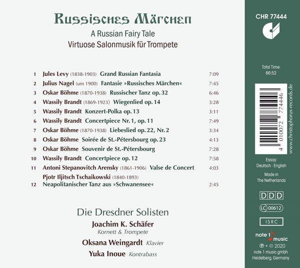 | Beschreibung: | The St. Petersburg Trumpet School at the beginning of the 20th century was famous and attracted the best trumpeters in Europe. At the same time, melodies from Russia exerted a great fascination worldwide. On his new album, Joachim Karl Schäfer presents virtuoso salon pieces for trumpet, which arose from this fascination for Russia and have titles such as "Grand Russian Fantasia", "Russian Dance" or "Soirée de St.-Pétersbourg". Composers such as Wassily Brandt, Oskar Böhme or Jules Levy were themselves among the best trumpeters of their time. Their bravura pieces sound light and elegant on the one hand, but are hardly ever played today because they are among the most difficult pieces written for the trumpet. Joachim Karl Schäfer presents a whole programme of these rarely played works and thus presents trumpet art of the highest class!, Runningtime: 00:00:00, Contrabass: Yuka Inoue (2), Cover: Viktor Vasnetsov, Ensemble: Die Dresdner Bach-Solisten, Executive-Producer: Joachim Berenbold, Layout: Joachim Berenbold, Liner Notes: Michael Bartsch, Liner Notes [Translated By]: Katie Stephens, Piano: Oksana Weingardt, Producer, Edited By: Eberhard Hinz, Trumpet, Cornet: Joachim Schäfer (5), Composed By: Jules Levy, Composed By: Julius Felix Nagel, Composed By: Oskar Wilhelmovitch Böhme, Composed By: Vassily Guéorguyévitch Brandt, Composed By: Vassily Guéorguyévitch Brandt, Composed By: Vassily Guéorguyévitch Brandt, Composed By: Oskar Wilhelmovitch Böhme, Composed By: Oskar Wilhelmovitch Böhme, Composed By: Oskar Wilhelmovitch Böhme, Composed By: Vassily Guéorguyévitch Brandt, Composed By: Anton Stepanovich Arensky, Composed By: Pyotr Ilyich Tchaikovsky, Labelcode CHS77444.2 (CHR 77444), Copyright (c) Note 1 Music GmbH, Phonographic Copyright (p) Note 1 Music GmbH, Manufactured By Promese, Recorded At Piano-Gäbler Dresden |