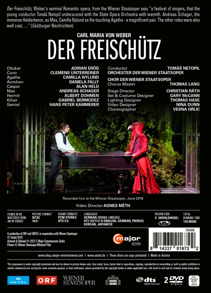 | Beschreibung: | Christian Räth's inspired staging of Der Freischütz, Weber's seminal Romantic opera, at the Haus am Ring stands out due to the bold set and costume design by Gary McCann. It was "a festival of singers, that the young conductor Tomas Netopil underscored with the State Opera Orchestra with warmth. Andreas Schager, the immense Heldentenor, as Max, Camilla Nylund as the touching Agathe - a magnificent pair. The other roles were also well cast... " (Salzburger Nachrichten) The production was recorded live at the Wiener Staatsoper in June 2018., Runningtime: 00:00:00, Labelcode CMAJ760008DVD |  | Darsteller: |